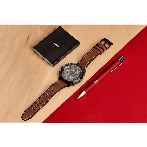 A Diesel Griffed Chronograph DZ4569 férfi karóra azoknak készült, akik a markáns megjelenést és a praktikus funkciókat egyszerre keresik. A barna, természetes bőrszíj elegáns részleteket ad, míg a korrózióálló nemesacél, kerek tok és a fekete, analóg számlap időtálló összhatást teremt. A számlapot tartós ásványi üveg védi.