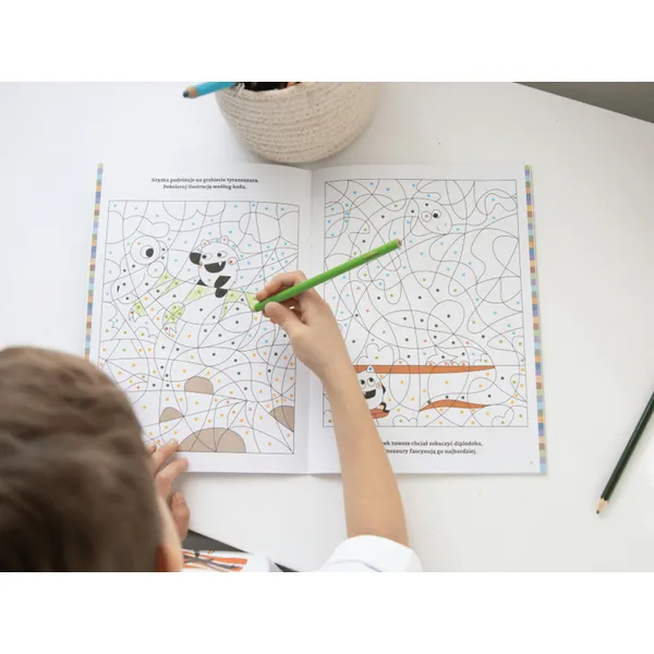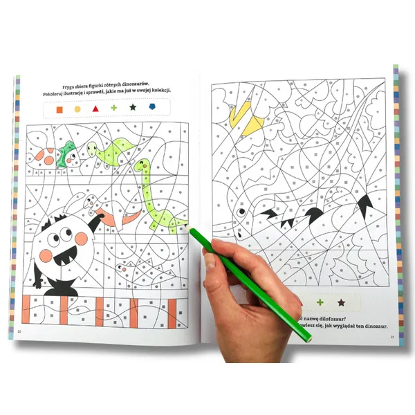 Kód szerinti dinoszauruszos színező, amely játékosan fejleszti a megfigyelést, a koncentrációt és a logikus gondolkodást. A változatos feladatok és a mellékelt színes matricák hosszú időre lekötik a gyerekeket, miközben kreatív, képernyőmentes időtöltést adnak.