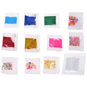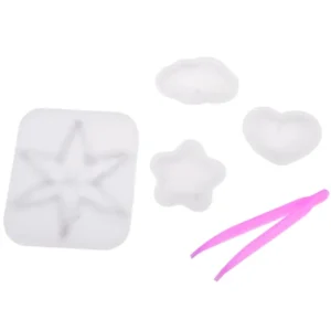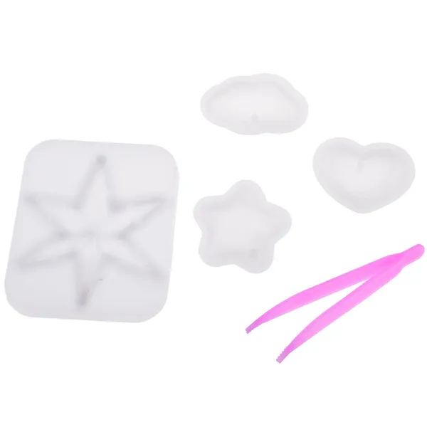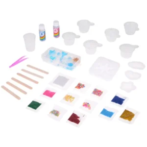 • Teljes tartalom: 4 szilikon öntőforma, 2 komponensű ragasztó (A+B), 6 csillámpor, gyöngyök és kristályok, 3 lánc, fa keverőpálcák, mérőpoharak, csipesz, kesztyű, tárolódoboz.