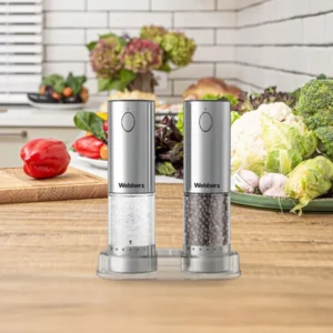 A 2 darabos, újratölthető elektromos só- és borsőrlő szett modern stílusával és letisztult INOX burkolatával azonnal feldobja a konyhát és az asztalt. Az állítható szemcseméretnek és a beépített LED-fénynek köszönhetően mindig pontosan annyi fűszert adhat az ételhez, amennyit szeretne – akár félhomályban is.