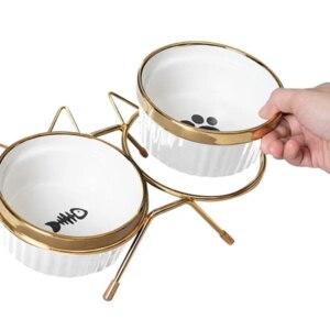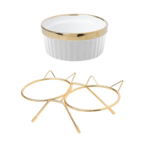 Kényelmes, rendezett etetéshez: a két kerámia tál külön eledelhez és vízhez használható, a stabil fém állvány pedig segít a helyén tartani a készletet. A fehér-arany dizájn könnyen illik az otthoni környezetbe, a kerámia felület pedig gyorsan és higiénikusan tisztítható.