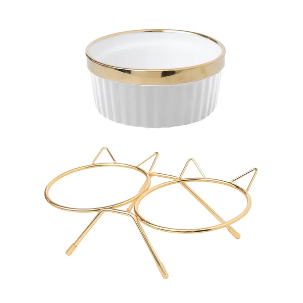 Dupla kerámia etető- és itatótál szett állvánnyal, 2×300 ml fehér-arany