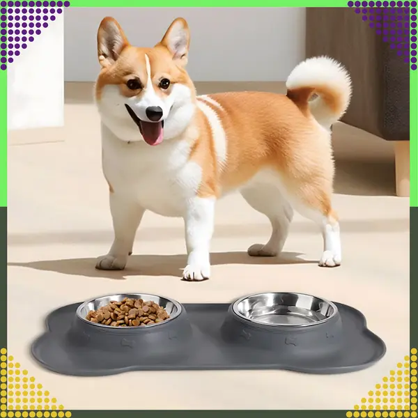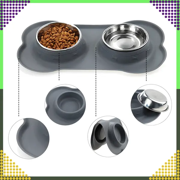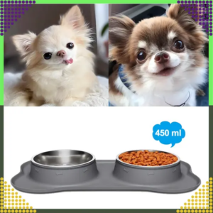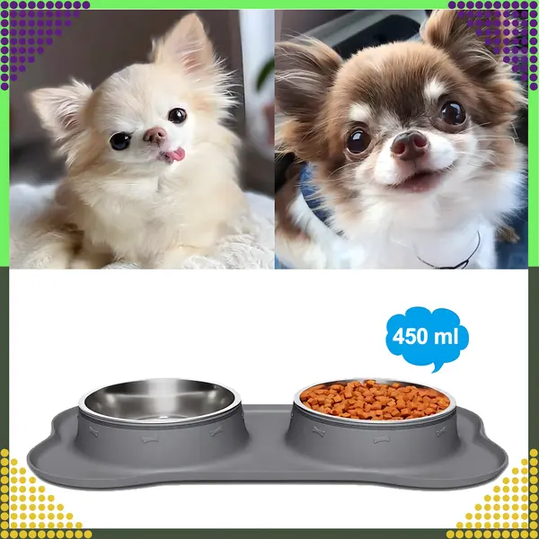 Dupla tál kutyáknak és macskáknak, rozsdamentes acél, csúszásgátló, szürke, 2×450 ml