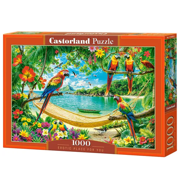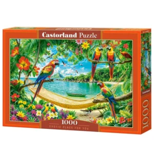 Merülj el a gondtalan vidéki tájban, ahol vidám kutyák heverésznek zöldellő réten és színes virágok között! Az 1 000 darabos „Egzotikus pihenőhely” puzzle kirakva 68×47 cm-es, részletgazdag képet ad, amely otthonod dísze lehet.