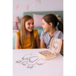 Az ékszerek elkészítése gyerekjáték: csavarja le a karkötő végét, fűzze fel a választott gyöngyöket és függőket, majd csavarja vissza a zárat – és már kész is az egyedi kiegészítő. A folyamat nemcsak szórakoztató, hanem fejleszti a kézügyességet és az önkifejezést is.