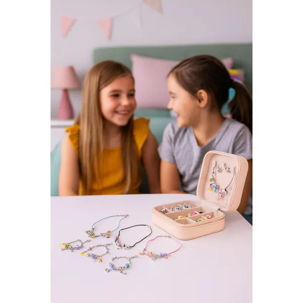 Az Ékszerkészítő szett 66 különböző elemmel varázsolja a játékot kreatív alkotássá. A három állítható karkötő és három nyaklánc alap, a színes gyöngyök, ezüstszínű charmok és mesés függők pedig végtelen kombinációt kínálnak – így minden kis tervező elkészítheti saját, megismételhetetlen ékszereit.