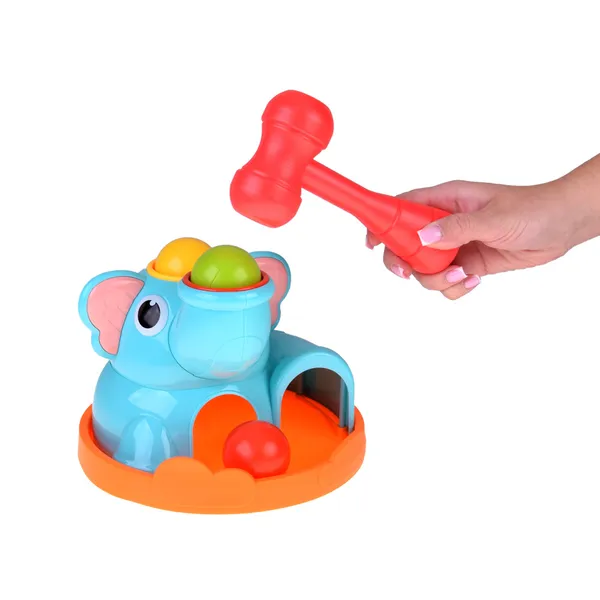 Legyen játék a tanulás már a legelső lépésektől! A kedves elefánt alakú sorterben három színes labdát lehet a kalapáccsal a megfelelő nyílásokba ütni, amelyek aztán vidáman legurulnak. A tevékenység nem csupán szórakoztató, hanem számos készséget is fejleszt.