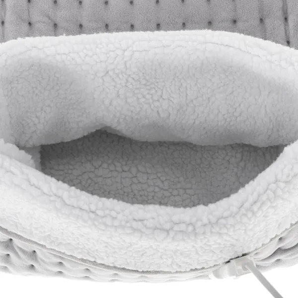 A biztonságot az automatikus kikapcsolás (90 perc után) és a túlmelegedés elleni védelem támogatja. Kívül puha plüss és szivacs borítást kapott, belül pedig egy kivehető, kellemes tapintású szintetikus gyapjú bélés található, amely a higiénia érdekében kézzel mosható.