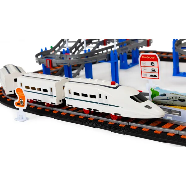 A piros off-roader könnyedén veszi a kanyarokat és emelkedőket, miközben a három kocsiból álló vonat pontosan halad a sínpályán. A stabil tartóoszlopoknak és a hídnak köszönhetően akár többszintes pályát is építhetsz, ami látványos és izgalmas versenyeket garantál.