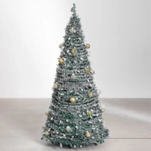 Élvezd az ünnepi hangulatot percek alatt: a teljesen feldíszített, összehajtható fenyő pillanatok alatt felállítható, és a beépített LED fényfüzér azonnal meleg, otthonos fényt varázsol a nappalidba. Masszív fémtalp, tartós műtűlevelek, elegáns gömbök és szalagok garantálják a pormentes, biztonságos dekorációt, amelyben évekig gyönyörködhetsz.