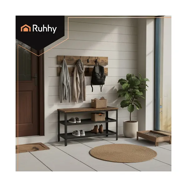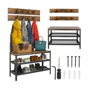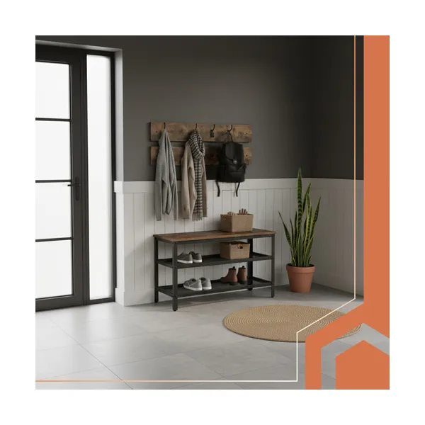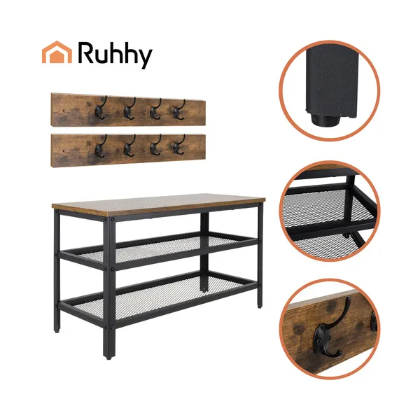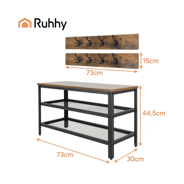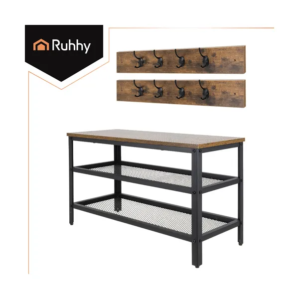 Helytakarékos előszobai megoldás, amelyben a cipők, kabátok és táskák egy helyre kerülnek: két szellős cipőpolc és 16 akasztó segít rendet tartani. A stabil acél váz és a barna MDF ülőfelület kényelmes cipőfelvételt ad, és jól illik modern loft enteriőrbe.