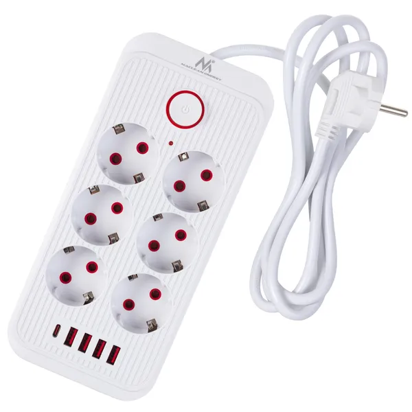 A Maclean MCE389 W elosztó ideális választás, ha egyszerre több eszközt kell biztonságosan táplálnod vagy töltened. Hat, 45°-ban elforgatott schuko aljzat, négy USB-A kimenet és egy USB-C port gondoskodik a laptopok, monitorok, konzolok, telefonok és egyéb kiegészítők energiaellátásáról.