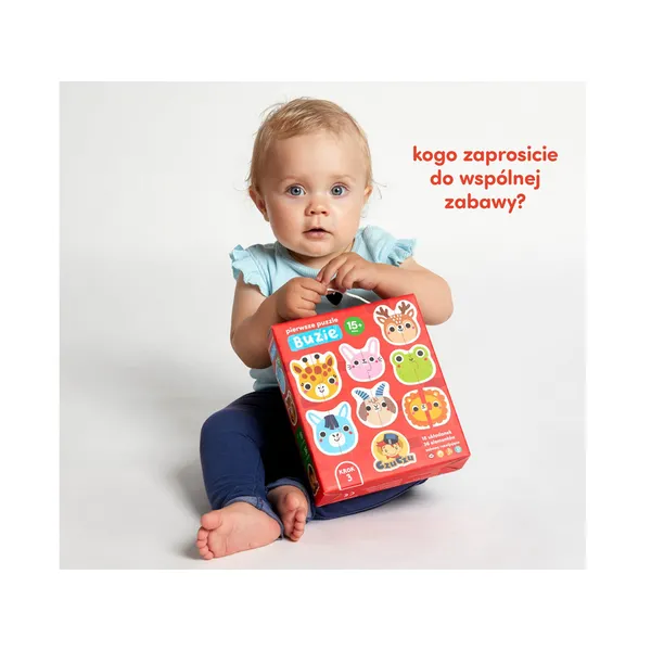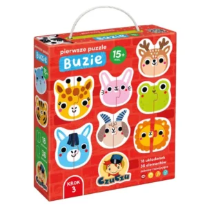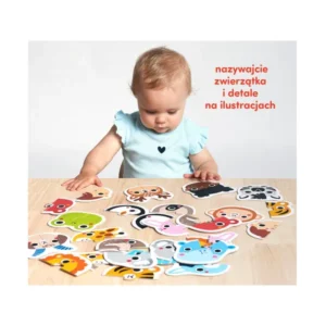 18 nagy, két darabból álló állatos puzzle vastag kartonból, amely önálló sikerélményt és finommotoros fejlődést kínál 15 hónapos kortól. Vidám képei inspirálják a közös játékot, hangutánzást és történetmesélést.