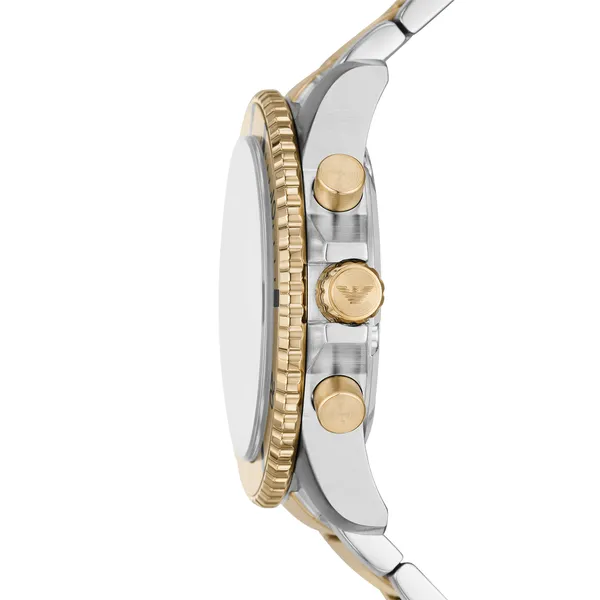 Az Emporio Armani AR11586 Diver egy elegáns, mégis sportosan karakteres férfi karóra, amelyet a divatos megjelenés és a mindennapi megbízhatóság igényeire terveztek. A tok és a szíj rozsdamentes acélból készült, arany árnyalatú PVD bevonatú részletekkel; a zöld számlapot ásványi üveg védi. A gondosan megtervezett forma nemcsak látványos, hanem praktikus is – hosszú távra ideális választás.