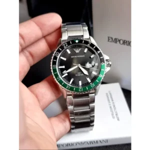 Az Emporio Armani AR11598 Diver GMT egy stílusos férfi karóra, amely elegáns öltözethez és mindennapi viselethez is jól illik. A letisztult, fekete számlapot karcálló ásványüveg védi, a dátumkijelzés pedig segít gyorsan követni a hónap napját. Az ezüstszínű tok és karkötő kiváló minőségű rozsdamentes acélból készült, bőrbarát bevonattal a kényelmesebb viseletért.