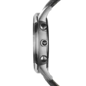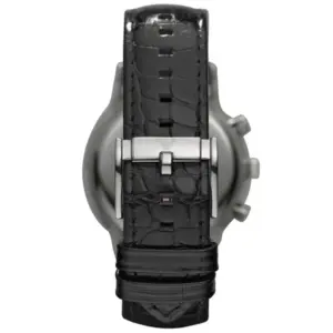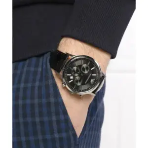 Elegáns, fekete bőrszíjas férfi karóra, amely stílusos megjelenést és praktikus funkciókat kínál a mindennapokra. A kronográf, a dátumkijelzés és az 50 méteres vízállóság kényelmes, sokoldalú használatot biztosít.