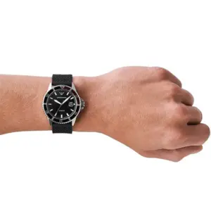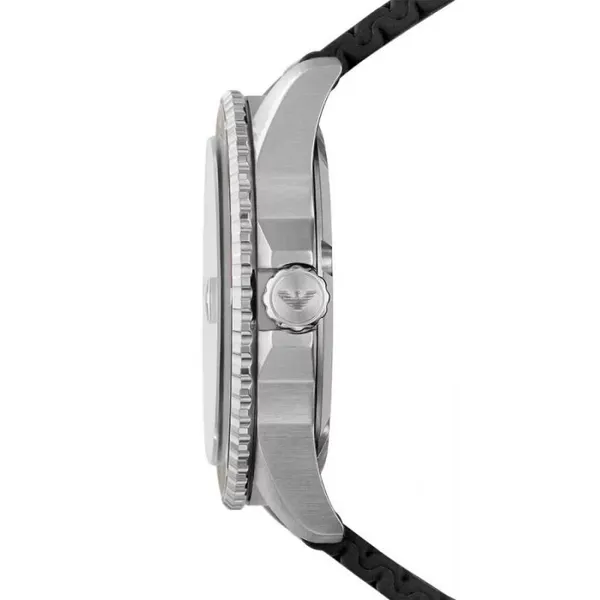 Az Emporio Armani AR11341 Diver férfi karóra sokoldalú választás mindennapi viselethez és aktív használathoz egyaránt. A fekete, napsugaras mintázatú számlapot ásványi üveg védi, a dátumkijelző pedig nagyítóval segíti a könnyű leolvashatóságot.
