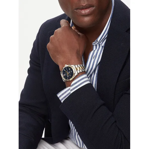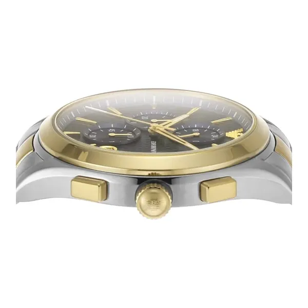 Az Emporio Armani AR11579 férfi karóra stílusos választás elegáns öltözékhez és mindennapi viselethez egyaránt. A tok és a szíj nemesacélból készült ezüst és arany színkombinációban, amely kifinomult megjelenést ad az órának. A kék számlapot ásványi üveg védi, rajta dátumkijelző, kronográf segédszámlapok, 24 órás kijelzés és diszkrét márkajelzés található.