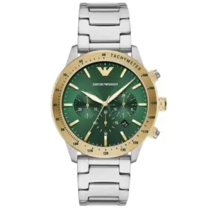 Az Emporio Armani AR11454 Mario férfi karóra elegáns és hétköznapi viselethez egyaránt remek választás. A sötétzöld számlapot ásványi üveg védi, a számlapon dátumkijelző, kronográf segédszámlapok és 24 órás kijelzés található. A rózsaarany árnyalatú indexek kifinomult, modern megjelenést adnak az órának.