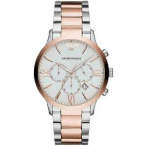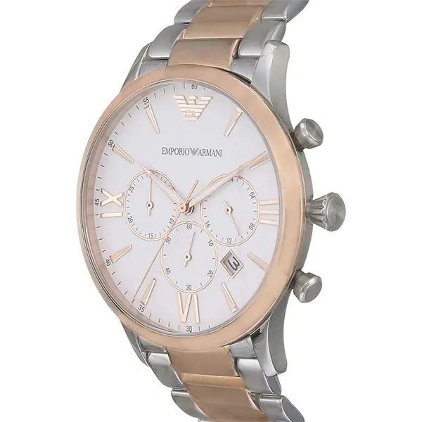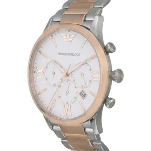 Az Emporio Armani AR11209 férfi kronográf karóra stílusos megjelenést és precíz időmérést kínál mindennapokra és alkalmi viselethez egyaránt. A 43 mm-es, kerek, rozéarany árnyalatú nemesacél tok és a kéttónusú (ezüst/rozéarany) nemesacél szíj elegánsan keretezi a fehér számlapot. Az ásványi üveg alatti indexek és mutatók finom rozéarany színben pompáznak, a dátumablak, a 24 órás kijelzés és a stopper funkció pedig megkönnyíti a mindennapi szervezést. 5 ATM vízállóságának köszönhetően a karóra ellenáll a fröccsenő víznek, az allergiamentes bevonat pedig kényelmes viseletet biztosít.