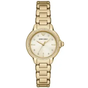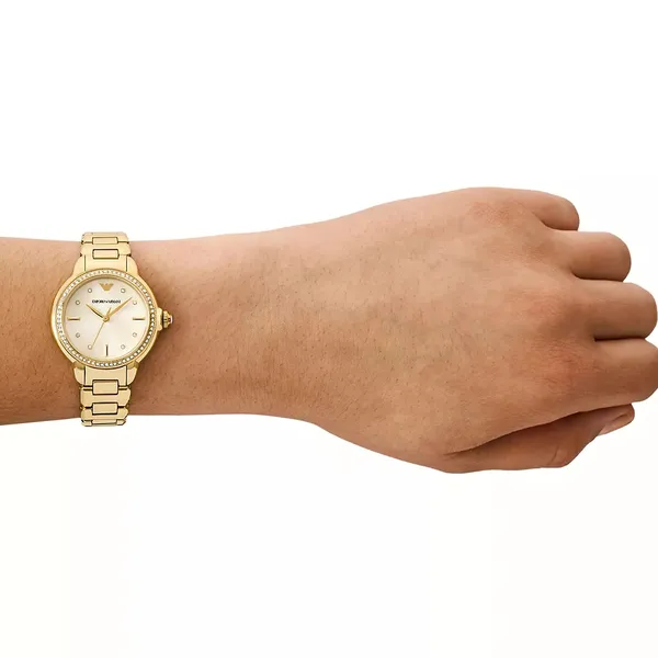 Az Emporio Armani AR11609 női karóra kifinomult, elegáns modell aranyszínű kivitelben, amely tökéletes választás mindennapi viselethez és különleges alkalmakra is. A rozsdamentes acél szíj kényelmesen simul a csuklóra, míg a kerek, aranyszínű számlapot finoman csillogó kristályok díszítik, amelyek exkluzív megjelenést kölcsönöznek az órának. A klasszikus vonalvezetés és a modern részletek harmonikus együttese igazán nőies kiegészítővé teszi ezt a modellt.