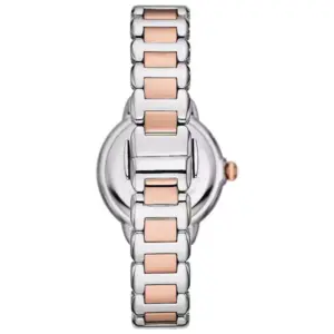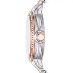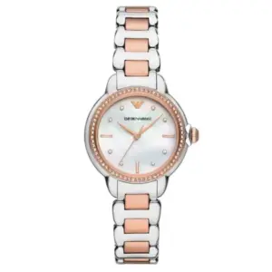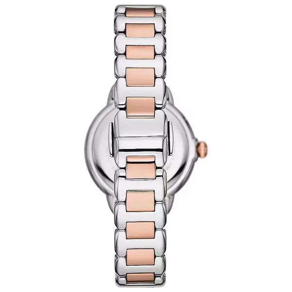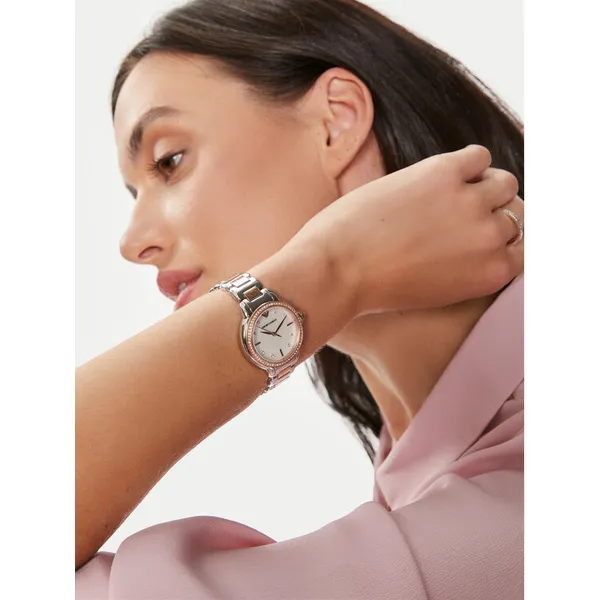 Az Emporio Armani AR11569 egy különleges női karóra, amely elegáns ezüst és rozéarany színvilágával azonnal magára vonja a figyelmet. A nemesacél szíj finoman simul a csuklóra, miközben a gyöngyház számlap kifinomult fénye és a kristályokkal díszített indexek luxus hatást keltenek. Az ékszerszerű kialakítású lünetta harmonikusan egészíti ki az összképet, így ez az óra tökéletes választás alkalmi és hétköznapi viselethez is.