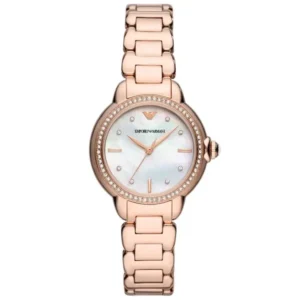 Az Emporio Armani Mia női karóra kifinomult megjelenést és mindennapi megbízhatóságot kínál. A rozéarany nemesacél tok és csiszolt szíj lágyan simul a csuklóra, míg a gyöngyház fényű számlapot apró kristály indexek díszítik, amelyek diszkréten ragyognak a fényben.