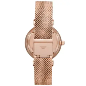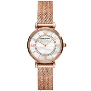 Az Emporio Armani AR11320 elegáns női karóra, amely kiváló választás különleges alkalmakra és mindennapi viseletre is. A tok és a milánói szövésű karkötő nemesacélból készült, rózsaarany színű bevonattal, amely kifinomult megjelenést és tartós használatot biztosít. A fehér, gyöngyház hatású számlapot ellenálló ásványi üveg védi.