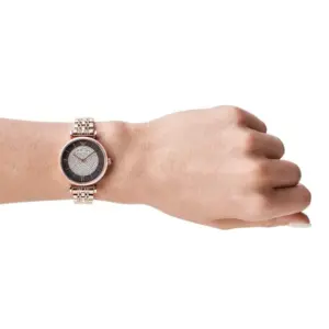 Az Emporio Armani AR11402 Gianni T-Bar egy elegáns női karóra, amely kifinomult megjelenésével hétköznapokra és alkalmi viselethez egyaránt ideális választás. A tok és a szíj rozéarany színű PVD bevonatú rozsdamentes acélból készült, amely tartós, esztétikus és kellemes viseletet biztosít. A barna számlapot ezüstszínű cirkóniadíszítés emeli ki, míg a megjelenést a karcsú, nőies forma teszi teljessé.