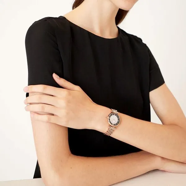 Elegáns, nőies karóra rozéarany színű acél kivitelben, barna cirkóniadíszes számlappal és kényelmes, tartós kialakítással. Pontos quartz szerkezete és letisztult megjelenése miatt remek választás mindennapi viselethez és alkalmi összeállításokhoz is.