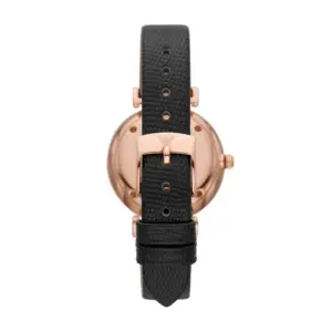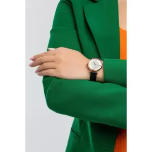 Elegáns, nőies karóra fekete bőr szíjjal és rózsaarany színű tokkal, amely könnyen kombinálható hétköznapi és alkalmi öltözékekhez. A pontos kvarc szerkezet, az ásványi üveg és a finoman díszített számlap egyszerre kínál stílust és megbízható használatot.