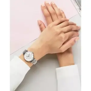 Elegáns, ezüstszínű női karóra rozsdamentes acél karkötővel és finoman csillogó, cirkóniákkal díszített számlappal. Kényelmes viselet a mindennapokban, stílusos választás ajándéknak és alkalmi megjelenéshez is.