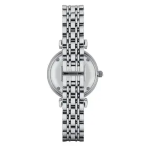 Elegáns, nőies megjelenésű Emporio Armani karóra, amely kifinomult választás hétköznapi viselethez és alkalmi öltözékhez is. Az ezüstszínű számlap cirkóniadíszítése különleges fényt ad az órának, míg a T-bar stílusú acél karkötő modern, letisztult összhatást biztosít.