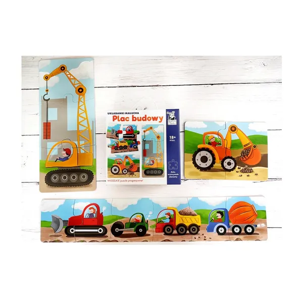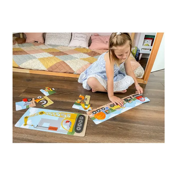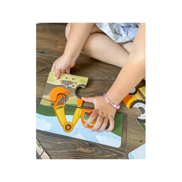 Az építkezés témájú, 18 hónapos kortól ajánlott babapuzzle három különböző nehézségi szintű kirakót tartalmaz, amelyekkel a kicsik játék közben fejleszthetik képzelőerejüket és logikai gondolkodásukat.