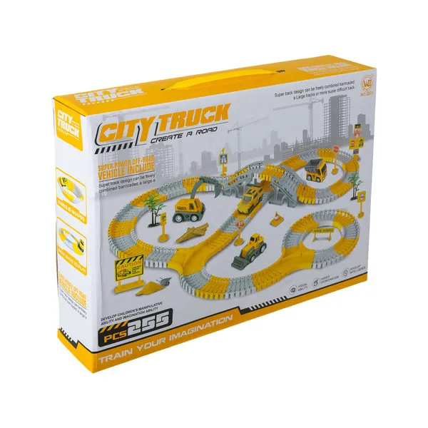Építkezős pályaépítő készlet 255 elemmel, amellyel a gyerekek mindig új nyomvonalat rakhatnak össze és izgalmas szerepjátékot játszhatnak munkagépekkel. Az összeszerelés közben fejlődik a finommotorika, a figyelem és a logikus gondolkodás, miközben a játék hosszú időre leköti őket.