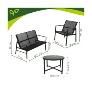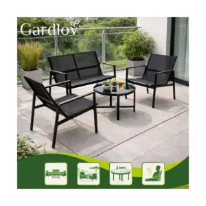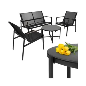 Szeretnél kényelmesen pihenni az erkélyen vagy a teraszon, de olyan összeillő szettet keresel, ami bírja a kinti körülményeket és könnyen tisztítható? Ez a 4 részes kerti bútor szett kész megoldást ad a kávézáshoz és a lazításhoz: párnák nélkül is komfortos, a légáteresztő ülőfelületeknek köszönhetően.