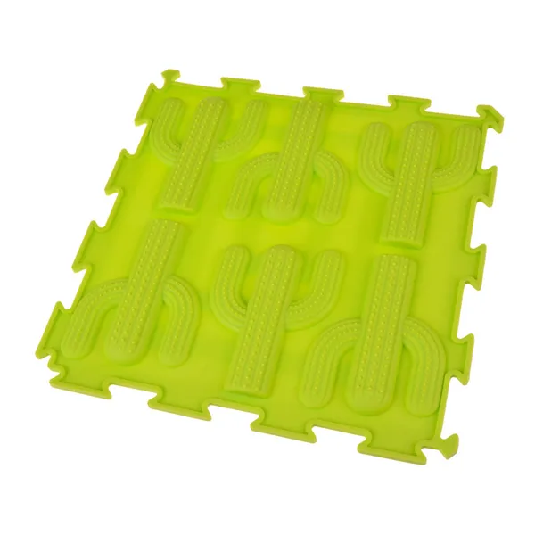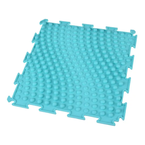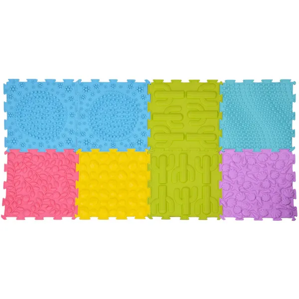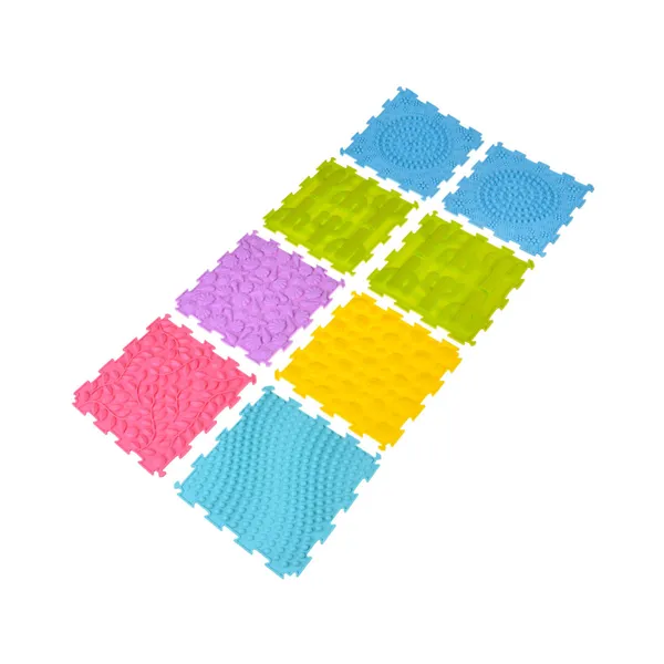 A 8 darabos érzékelő puzzle gumiszőnyeg vidám, pasztell színű modulokból áll, melyek mindegyike 24,5 × 24,5 cm-es és 1 cm vastag. Különböző mintázataik és reliefjeik játék közben stimulálják a talpi idegvégződéseket, fejlesztik az egyensúlyt és erősítik a lábboltozatot.
