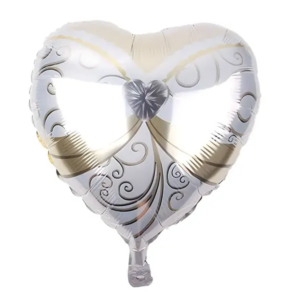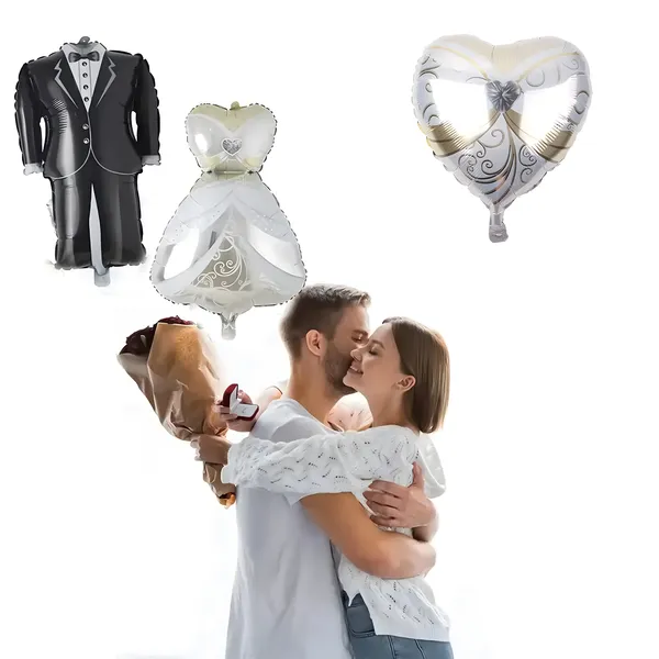 A romantikus hangulat garantált ezzel az 5 darabos esküvői fólia lufi szettel, amelyben a menyasszonyi ruha, az elegáns öltöny, két összefonódó szív és egy csillogó eljegyzési gyűrű formájú ballon kapott helyet.