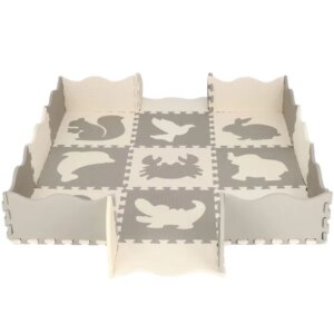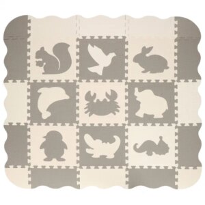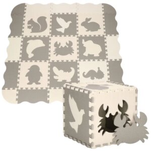 Puhán párnázott, vízálló EVA habszivacs játszószőnyeg, amely 120×120 cm-es felületet ad a padlón vagy a gyepen, és segít tompítani az ütődéseket. Az állatmintás, kivehető formák játékosan fejlesztik a finommotorikát, a könnyen tisztítható felület és a hordtáska pedig praktikus mindennapokra.