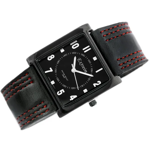 Extreim női kvarc karóra, fekete számlap, fekete textilszíj piros varrással