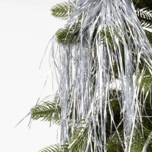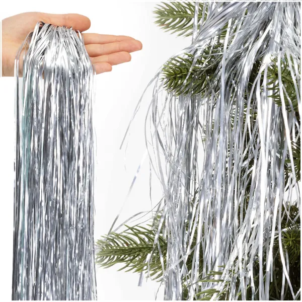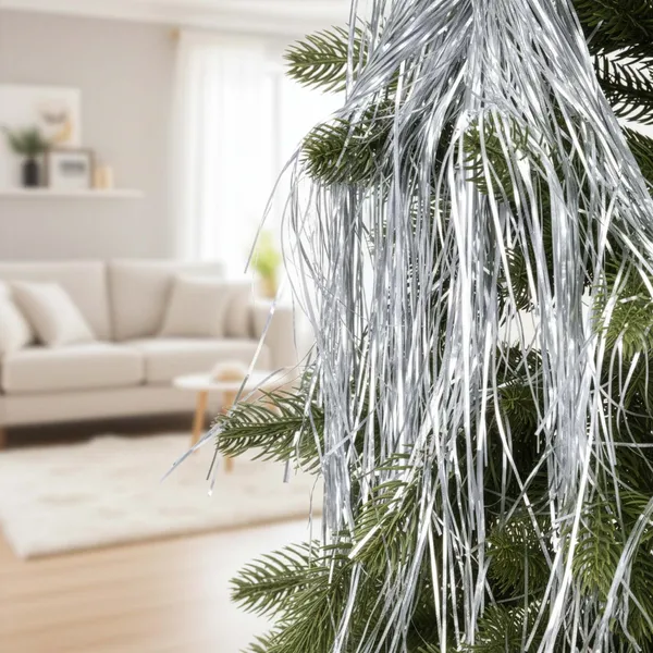 Ünnepi angyalhaj karácsonyfára – elegáns, ezüst csillogással. A könnyen formázható, PVC anyagú dísz gyorsan feldobja a fenyőt, koszorút vagy asztali dekorációt, és szépen kiemeli a fényeket és gömböket.