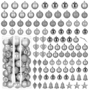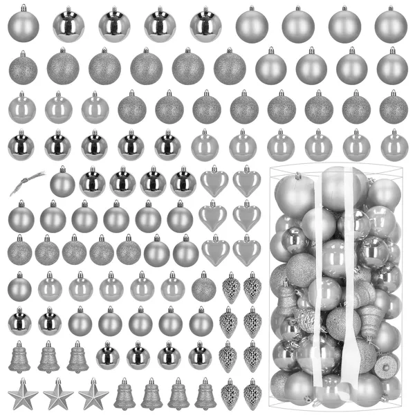 100 könnyű, törhetetlen ezüst gömbdísz különböző mérettel és felülettel, hogy a fa ragyogó és biztonságos legyen. A mellékelt zsinórokkal azonnal felakaszthatod, és a készlet egy teljes, közepes méretű fenyőt is bőségesen beborít.
