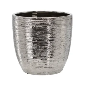 Tükörfényes ezüst kerámia kaspó, amely kiemeli növényeid szépségét, tartós kialakítása pedig hosszú éveken át megőrzi ragyogását.