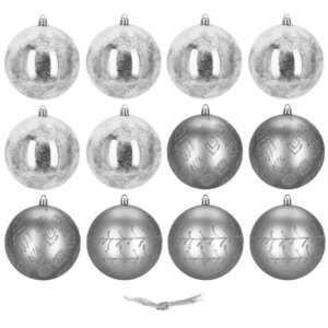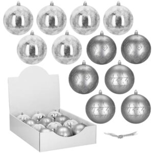 Törésálló, ezüst színű karácsonyfadísz válogatás többféle felülettel (havas, fényes és félmatt csillámos). A csomag 12 darabot és ingyenes akasztózsinórokat tartalmaz, így gyorsan, biztonságosan és egységes stílusban díszítheti fel a fát.