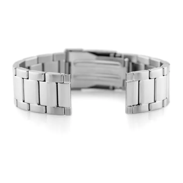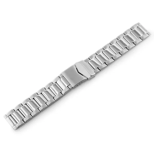 Kiváló minőségű, ezüstszínű rozsdamentes acél óraszíj, amely elegáns megjelenést és megbízható mindennapi használatot kínál.