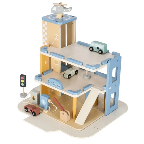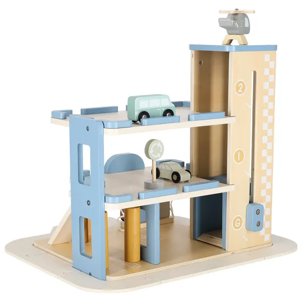 A tömör fából készült, 3 szintes parkoló lifttel, benzinkúttal és 3 járgánnyal fejleszti a finommotorikát és a szerepjátékot. Tartós kivitelének és valósághű részleteinek köszönhetően hosszú órákra leköti a 3 év feletti gyermekeket.