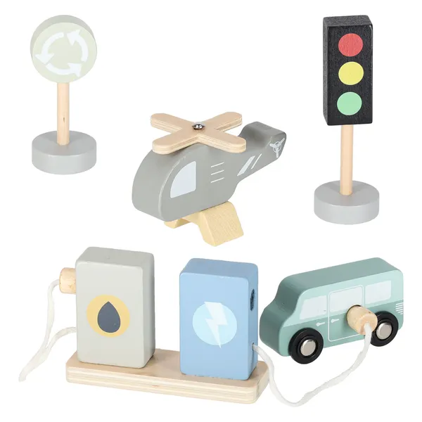 • Gazdag tartozékkészlet: 3 autó, helikopter, táblák, sorompó és útelemek a teljes élményhez.