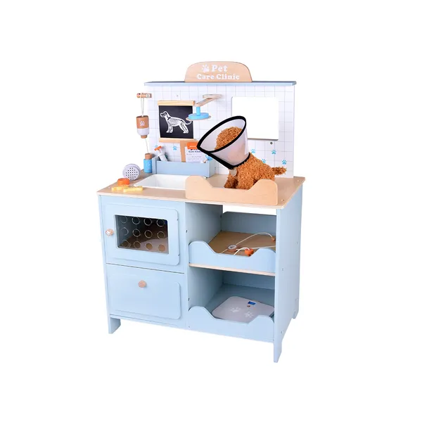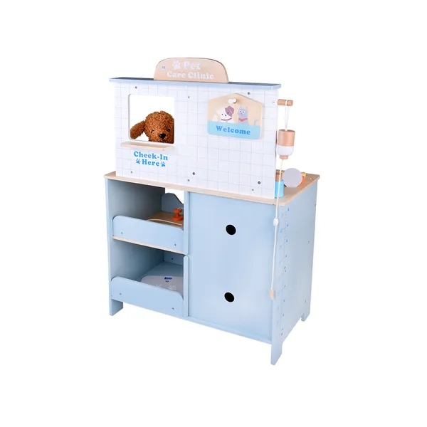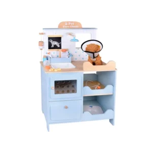 Részletgazdag fa állatorvosi rendelő plüss kutyussal, ahol a gyerekek vizsgálhatnak, ápolhatnak és „gyógyíthatnak” a sok kiegészítővel. A szerepjáték fejleszti az empátiát, a kommunikációt és a finommotorikát, a tárolós polcok pedig segítenek rendben tartani a felszerelést.