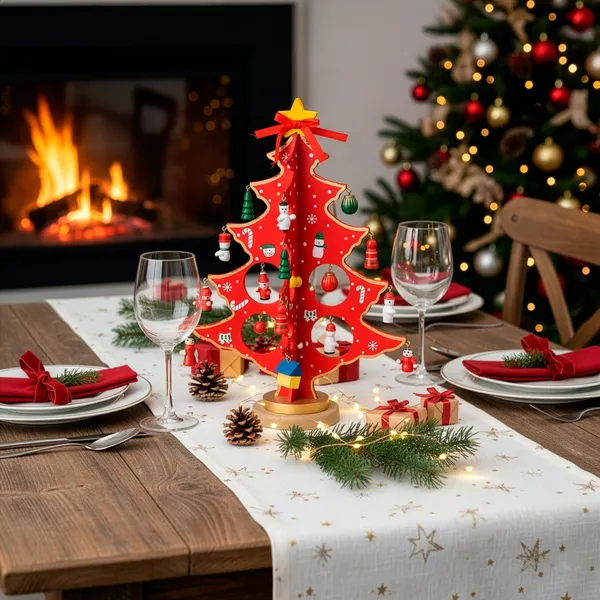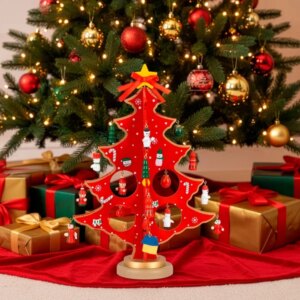 Hangulatos, fafából készült asztali karácsonyfa, amelyhez 25 élénk színű, fémhoroggal rögzíthető minidísz tartozik. Könnyen összeállítható, újrahasználható, és ideális, ha kis helyen szeretnéd megteremteni az ünnep varázsát.