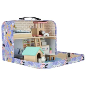 A hordozható, kétszintes babaház és állatpanzió élénk szerepjátékra ösztönzi a kicsiket, miközben a bőröndbe pakolva pillanatok alatt rend lesz. A 18 tartós fa és textil kiegészítővel a gyerekek bárhol felépíthetik saját mini világukat.